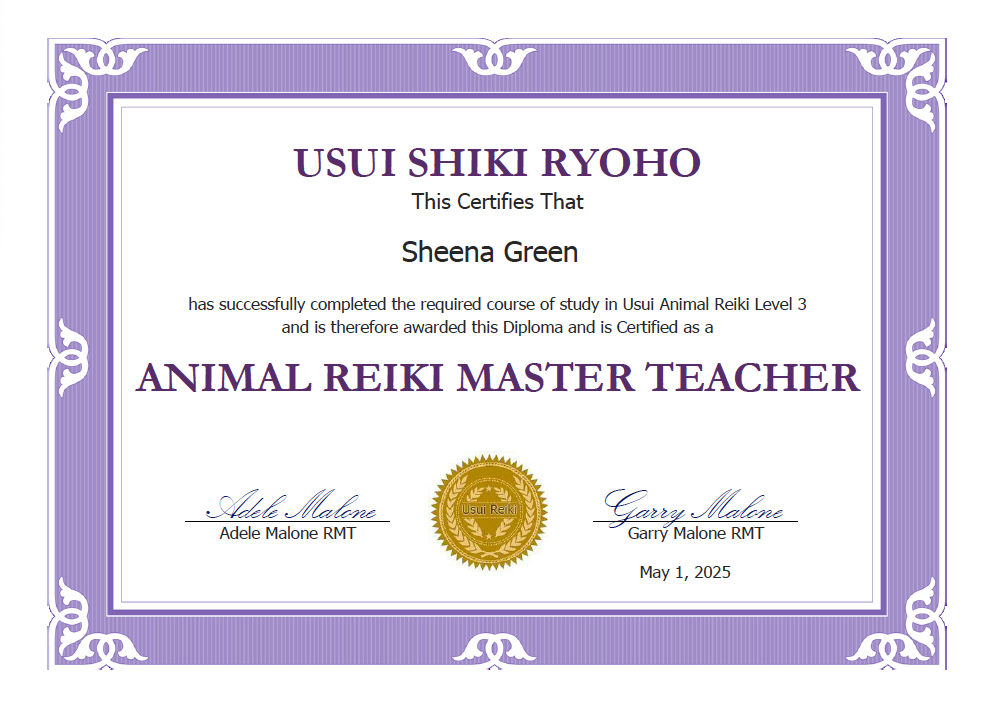 Certified Animal Reiki Master/Teacher through the Reiki Healing Association