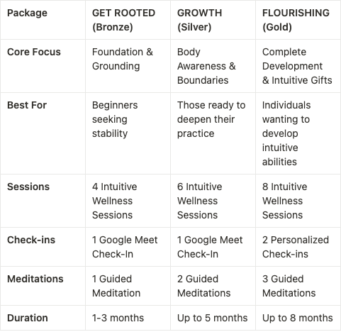 Many clients start with GET ROOTED and continue progress with standalone Intuitive Wellness Sessions to develop their practice. However, you can start at any level based on your current experience and needs.